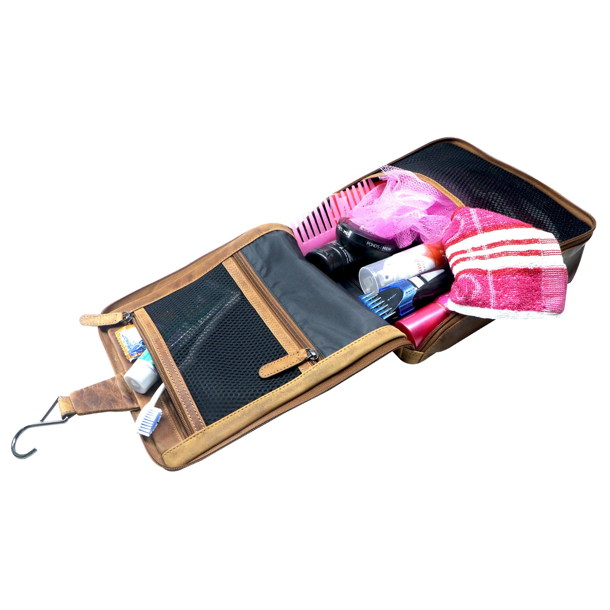 Hanging leather toiletry bag